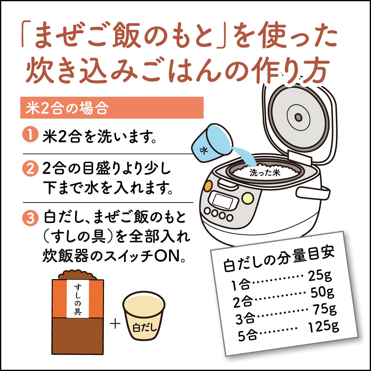 ●まぜご飯のもと(すしの具)/市販の酢飯の素やお好みの分量で酢飯をご用意していただき、本商品と混ぜるだけで簡単に本格的なお寿司やまぜご飯ができます。また、白だしを加えて炊き込みご飯も美味しくできます。※レシピ参照